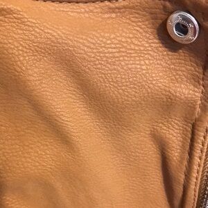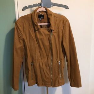 Stylish moto jacket tan jacket perfect for any occasion. Features a sleek design with zippered pockets for added functionality. Faux suede material and has pretty crosshatch design on it. I think I wore it maybe two times. Great for spring it is light weight