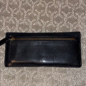 Sleek black leather wallet by Frye. Perfect for everyday use.