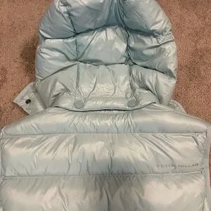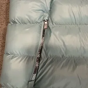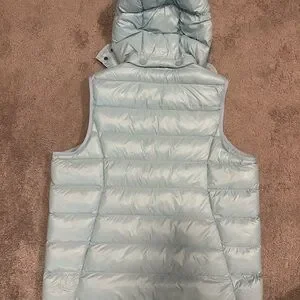 Stylish light blue puffer vest with a detachable hood. Features a front zipper and side pockets.