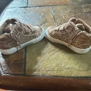 Add a touch of sparkle to your child's outfit with these glittery gold shoes. Perfect for any occasion, these shoes offer both style and comfort.