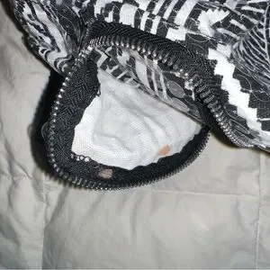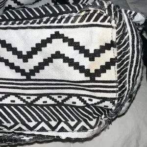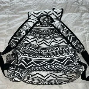 Stains pictures. They aren’t noticeable. Sequin design is all intact. Black and white Aztec print. Standard size backpack, not a mini or medium size.