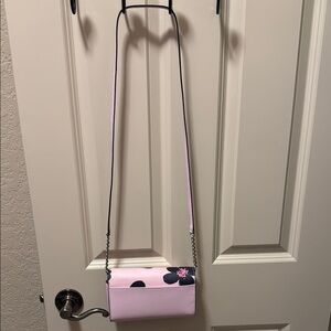 Stylish Kate Spade crossbody bag with a pink and black floral design. Like new; worn a few times. Small stain on bottom right corner but otherwise free from scratches and stains. Perfect for adding a chic touch to any outfit. Comes from a pet-free, smoke-free home.