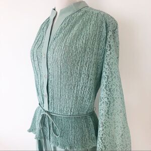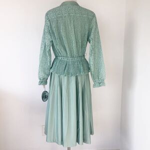 New with tags Secretary dress by Discovery. Upper lace bodice with balloon long sleeves. Button front closure, elastic waist, unlined, elastic cuff, midi length.