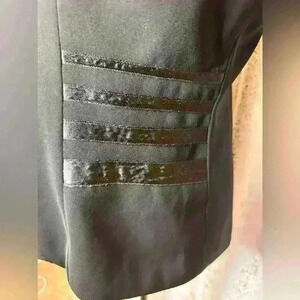 80s Vintage black and red blazer. 50% Wool 50% Silk. With a beautiful metal and rhinestone clasp and satin horizontal trim on the pockets. Red satin collar and sewn in shoulder pads. Fully lined. Jacket is in perfect condition. Pit to pit 19” length 24” arms 22 1/2”