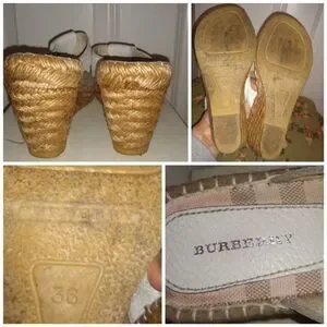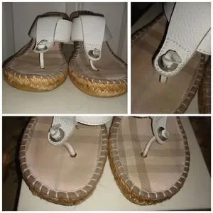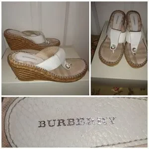 Burberry white wedge thong sandles. The wedge is natural fibers. Features the iconic plaid fabric in pink and tan. White pebbled leather with silver toned logoed hardware. Size 36 or 6 some minor flaws please see photos. Overall great condition!