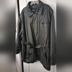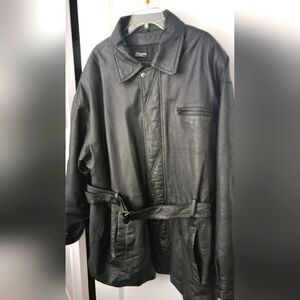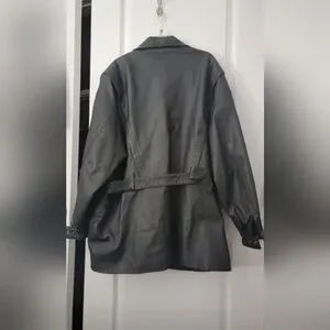 Stylish and durable black leather jacket perfect for any occasion. Features a sleek design with a belt for a tailored fit.