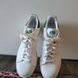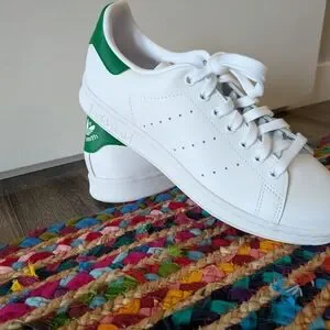 Never worn. Classic Adidas Stan Smith sneakers in white with green accents. Perfect for casual wear.