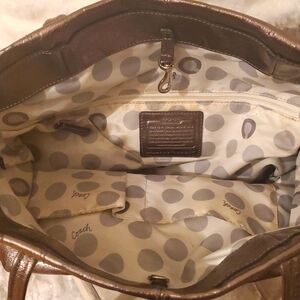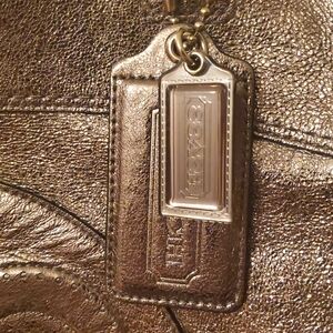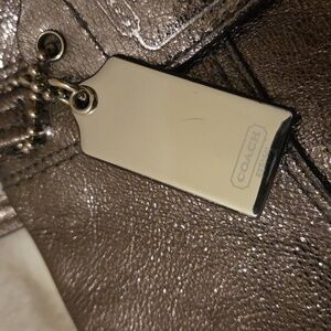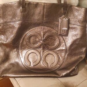 Coach Authentic Stylish metallic tote bag perfect for any occasion. Features a sleek design with ample space for essentials. There is a big zipper pocket with a very tiny pink tint on it's which inside the pocket on bottom so you can't see it which I took a picture of. there is also 2 more extra pockets one is a medium the other is a small. this bag is a stunning color overall and is just gorgeous to look at with the front design. this bag is in great condition.