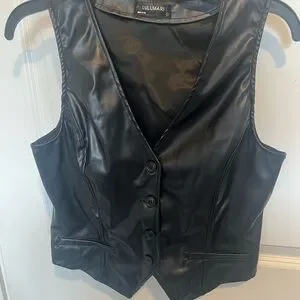 This Lulumari vest showcases a sleek black leather design with a fitted silhouette and a classic V-neckline. Its smooth texture and tailored fit make it a versatile addition to any wardrobe, perfect for adding a touch of sophistication to your look. Never been worn.