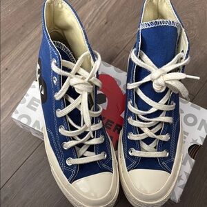 Stylish blue high-top sneakers featuring white laces. Perfect for casual wear. Women’s sizes 8 men size 6.. worn a few times one lace is dirty can be washed. Good condition