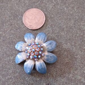 Silver and Blue Floral Brooch with Rhinestone Middle