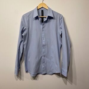 This shirt's destination? Wherever you're going. Stretchy, easy-care fabric on this commute-friendly button-up helps you arrive ready for anything. A light blue. In excellent condition. Size medium.