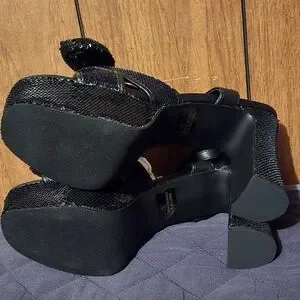 Never worn heel height: 4.25 in cushioned insole All over sequin fabric bow detail open toe buckle closure