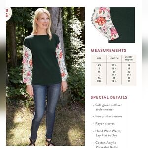 Questions? Leave a comment below!Add a pop of color to your wardrobe with this Matilda Jane Wonderment Fancy and Flouncy Top in size M. The floral print sleeves on this knit sweater-like top features a round neckline and long sleeves. It has a pullover closure and is made of a cotton blend knit fabric, perfect for all seasons. The easy-care blouse has a regular fit, making it a versatile and stylish addition to any casual occasion. The teal top is ideal for the bohemian or art lover, featuring a colorful and botanical theme. This blouse is perfect for the winter, summer, fall, and spring seasons, making it a must-have for any fashion-forward woman.