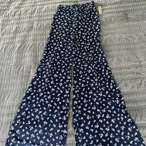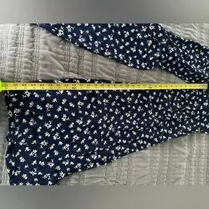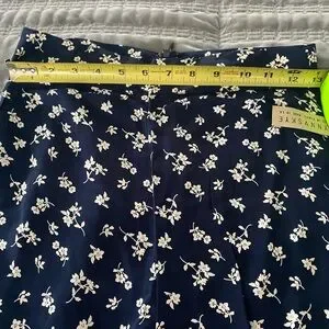 wide leg, flair, back zipper, unlined. navy blue with white flowers. 100% rayon
