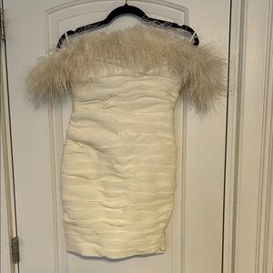 Chic off-shoulder white dress featuring luxurious feather detailing. Perfect for special occasions.