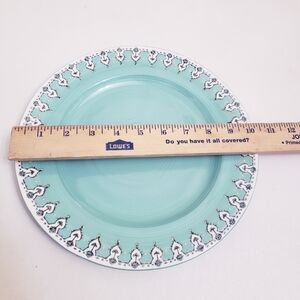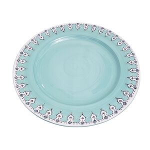 Anthropologie ELKA AYAKA Ceramic 10 1/4" Dinner Plates, set of 2. Beautiful teal dinner plates feature hand-painted black and white designs and raised yellow dots.