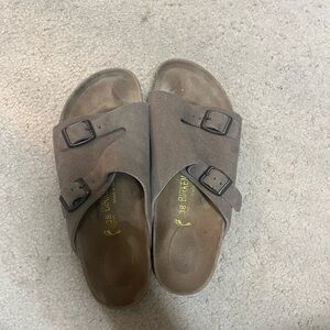 Experience comfort and style with the Birkenstock Zürich Suede Leather Sandals in taupe. Perfect for casual outings. Very briefly worn, note small area of discoloration in photo 4. Unisex; L7M5. Can typically ship same day or next day!