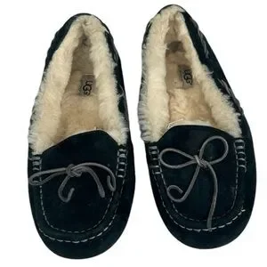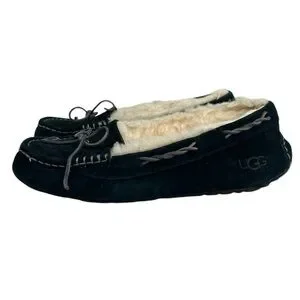 UGG Women SZ 9 TATE 10164 Black Suede Wool Lined Slip On Moccasin Slipper Shoe