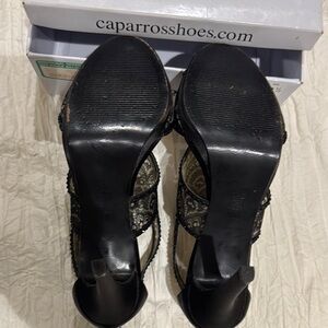 Elegant black lace heels by Caparros, perfect for any special occasion. These stylish shoes offer a sophisticated look with intricate lace detailing. Worn twice like new