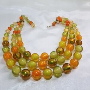 3 strand beaded necklace. Multicolor peach, green, tangerine. Circa 1950s/1960s.