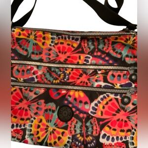 Brightly colored butterfly patterned crossbody bag by Kipling. Adjustable strap. Zippered pockets galore! Great size. See pics for measurements. EUC. No stains on inside lining.
