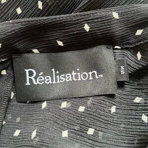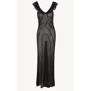 Réalisation Par The Lila Dress. Color: Black & white ‘Celestial’ print. Size: XS. The Lila with her delicate capped frill sleeve, seam detailing and back waist tie, is here to make you feel your most feminine self. Full length slip dress. Adjustable waist tie for the perfect fit. Slip on style, no zip. Bias cut. No lining. Sheer dress with panelled detailing. Style with high waisted underwear; a bodysuit; or slip for more coverage. 100% Silk Crepon. Dry clean only.