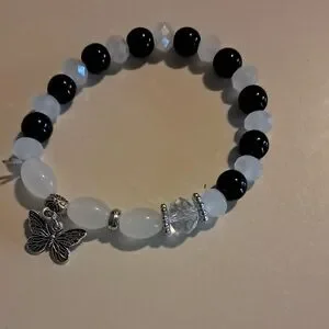 This elegant bracelet features a stunning combination of black and white beads, complemented by a charming butterfly pendant. Perfect for adding a touch of sophistication to any outfit.