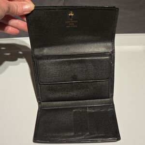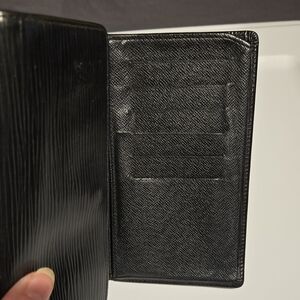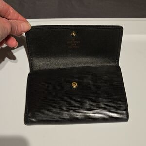 Louis Vuitton black Epi wallet. Inside of wallet does have peeling in 2 pockets as shown in pictures. Sold as is. Measures 6L x 4.5H.
