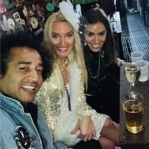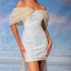 Shine in the Off-Shoulder White Dress. This elegant piece features a stunning white base adorned with delicate bridal accents including a train. Perfect for engagement; bachelorette parties; and even your wedding 💒! Built in bra included and it is very comfy and super sparkly!