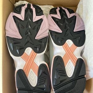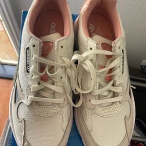 Brand new, comes with box. Has just been sitting in my closet. Too big for me. They’re true to size Women’s 7 1/2.