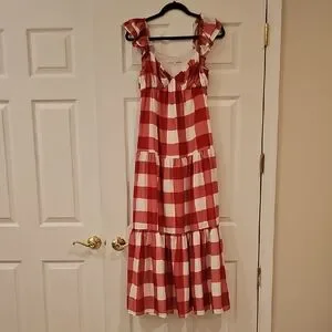 Cute red and white gingham dress by English Factory with ruffle straps/sleeves. Lined and zipper on the side. Perfect for upcoming spring/summer outings. I'm 5'5" and it goes to my ankles. Like new, worn maybe twice. Washed in cold on gentle cycle and hung to dry.
