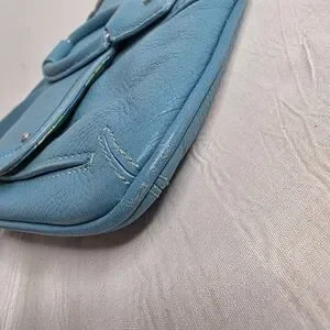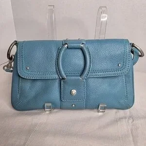 This Sigrid Olsen shoulder bag purse is a must-have for any stylish woman. The exterior is made of high-quality soft blue leather, giving it a sleek and sophisticated look. The bag features a shoulder strap for easy and comfortable carrying, pocket Inside the back beautiful signature silky lining, magnetic closure.