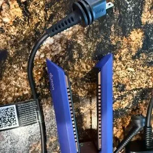Sleek blue Dyson hair straightener. Includes power adapter. Ideal for styling.