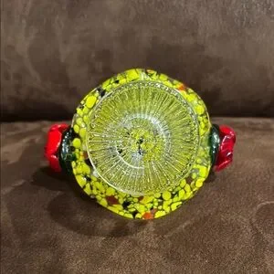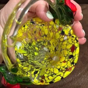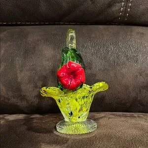 Beautiful Vibrant glass basket with red and green floral accents Approx 7 and a quarter by 5 inches