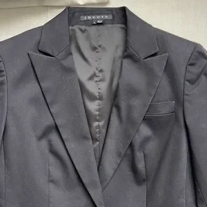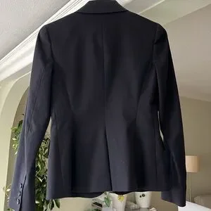 Pre-loved theory cotton blend black jacket in size 0. Like new. Doesn’t fit me anymore. Wore a few times. Perfect for the office or to dress up jeans.