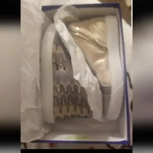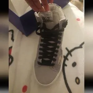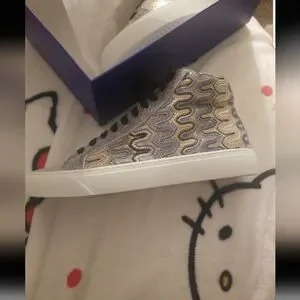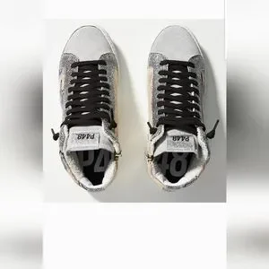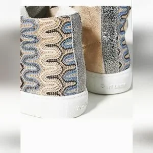 P448's O.G., the high-top Star sneaker has a sleek, slim silhouette and side-zip closure. This sneaker features one side of lurex embroidery paired with an inner of cracked metallic leather Round toe Flat