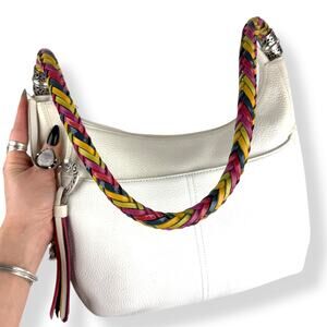 BRIGHTON Barbados Ziptop Hobo white leather shoulder bag with rainbow strap. Genuine pebbled white leather. Two deep pockets on outside of the front and two deep pockets on the back. Fully zippers shut along the top. Classic BRIGHTON heart dangle on strap and zipper, Rainbow braided strap with silver hardware. Inside is immaculately clean printed patterned blue cotton fabric with a full zippered pocket and two small pockets. There is a key holder strap. BRIGHTON authenticity logo tag and bag number inside on poacket. Measures 12' across top, 13.5" across middle, 8.5" across bottom, 10" tall and 3.25" deep. Strap drop measures 14". Excellent condition with very minimal signs of wear. Originally $395. This color combo is not in production any more and has been sold out for years.