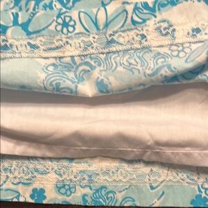 Adorable & sporty blue girls skirt with lion & floral motif perfect for spring & summer. Side zipper, fully lined, hemmed with lace showing the Lilly logo.
