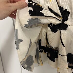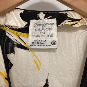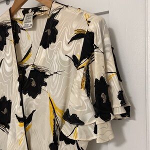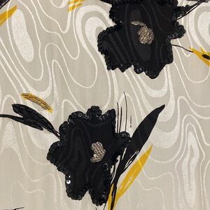 In excellent vintage condition. 100% silk. Features a gorgeous floral print with beaded embroidery. The peplum has a sheer tulle built in for a structured shape. Shoulder pads with a layered flutter sleeve. Hook & eye closure.
