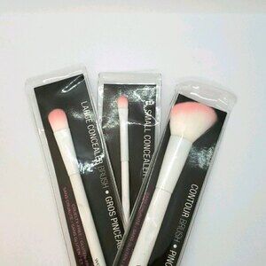 Set comes with 1 Small Concealer Brush, 1 Large Concealer Brush, & 1 Contour Brush. All brushes feature two-toned, synthetic, polymax fibers that mimic natural hair consistency. Holds cream, powder, & liquid without absorption. Cruelty-free, Vegan. New - Unused.