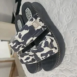 Experience ultimate comfort and style with Hey Dude's black and white sandals. These open-backed slip-ons feature a durable rubber sole and a sleek design, perfect for casual outings. The fabric upper ensures breathability and a snug fit for all-day wear. adjustable straps for even more comfortable wear