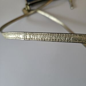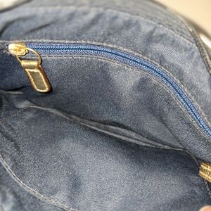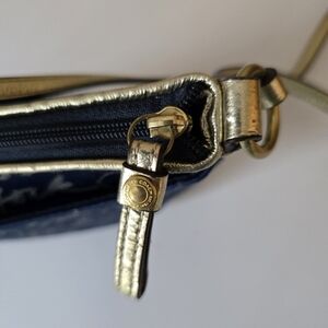 In like-new condition. COACH Poppy Signature Script Lurex Blue Gold Jacquard Leather Crossbody.