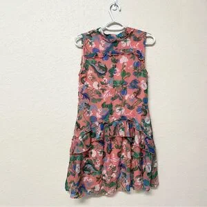 Saloni Tilly 100% Silk Pink Floral Button Up Ruffle Dress Size 2 Sleeveless