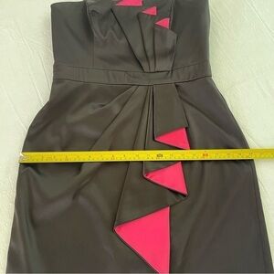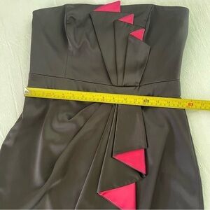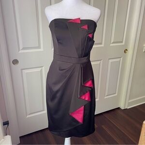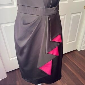 WHBM Satin Strapless Cocktail Dress Faux Wrap Front Black with Pink Pleating Detail. Gorgeous strapless black satin cocktail dress with fuchsia pink pleating detail at chest and in a continuing cascade from waist giving a faux wrap effect. Nicely weighted to drape beautifully. Fully lined with boning to give the most figure-flattering, hourglass silhouette. Poly/spandex blend keeps you comfortable with a nice amount of stretch. Hidden back zipper with hook and eye closure. Dry Clean.