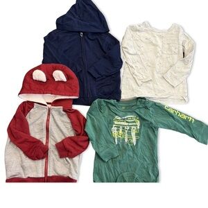 All size 18 months. 2 long sleeve onesies and 2 hoodies. Brands include Carhartt, Little Co. by Lauren Conrad, Cat & Jack and Old Navy.