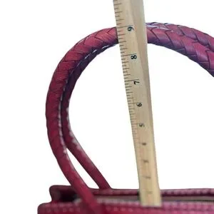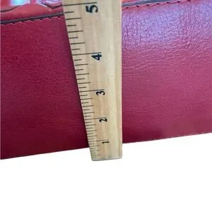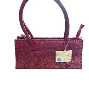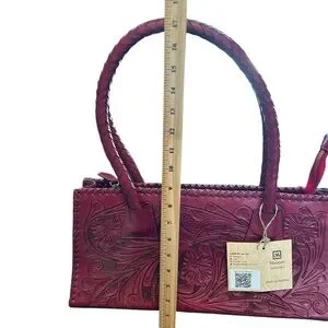 This elegant red handbag features intricate embossed detailing, perfect for adding a touch of sophistication to any outfit. Handtooled by Mauzari.