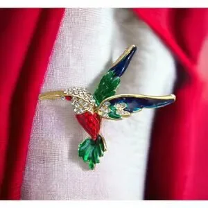 Sweet pave' rhinestone and enamel hummingbird pin. No wear or damage on this pin. Goldtoned metal, red-green-blue enamel, pave' set clear rhinestones, red rhinestone eye. 2" x 2.25".
