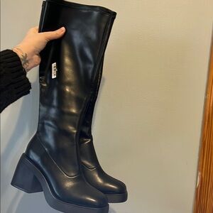 Tag missing. Elevate your style with these sleek black heeled boots from Wild Fable. Featuring a knee-high design, these boots are crafted from a smooth leather-like material and boast a chunky block heel for added height and stability. The rounded toe and sturdy sole ensure comfort and traction, making them a versatile addition to your wardrobe.