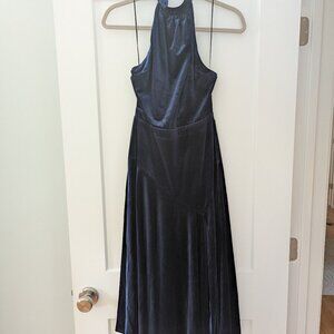 Velvet halter dress by Yumi Kim in size medium, dark navy. Features a high-neck halter with double-button closure and front slit.